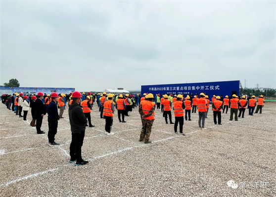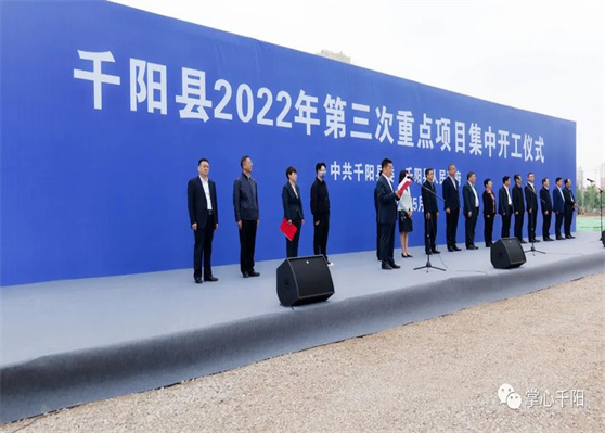 5月10日,千阳县2022年第三次重点项目集中开工仪式在千阳县西新区举行。本次集中开工的17个重点项目,总投资18.9亿元,年度投资7.4亿元,涉及现代农业、县域工业、文化旅游、新型城镇化、生态环境、乡村振兴和民生保障七大领域。(其中,现代农业项目2个,年度投资1500万元,分别为奶山羊养殖场和玉米秸秆加工项目;县域工业项目1个,即年度投资2.5亿元的海螺商砼、装配式建筑及构件项目;文化旅游项目1个,即年度投资760万元的旅游文创产品孵化基地项目;新型城镇化项目4个,年度投资3.9亿元,分别为西新区新型城镇化、老旧小区外配套、燕伋大道提升改造、通村联网路项目;生态环境项目1个,即年度投资500万元的城乡建设用地增减挂钩项目;乡村振兴项目6个,年度投资5630万元,分别为千高路和普社街道提升改造、常南乡村公路一期、福驮道路、农村居民科学储粮及仓储设施改造、农村饮水工程维修养护及水资源监测设施项目;民生保障项目2个,年度投资1460万元,分别为康养社区和失能人员护理楼建设项目。)