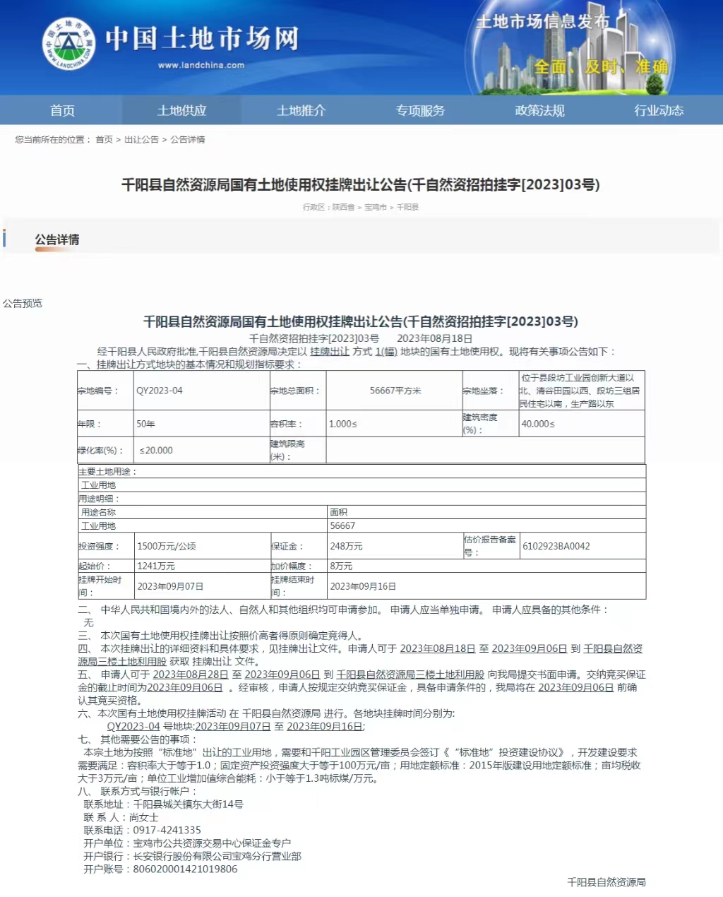 千阳县自然资源局国有土地使用权挂牌出让公告(千自然资招拍挂字〔2023〕03号)