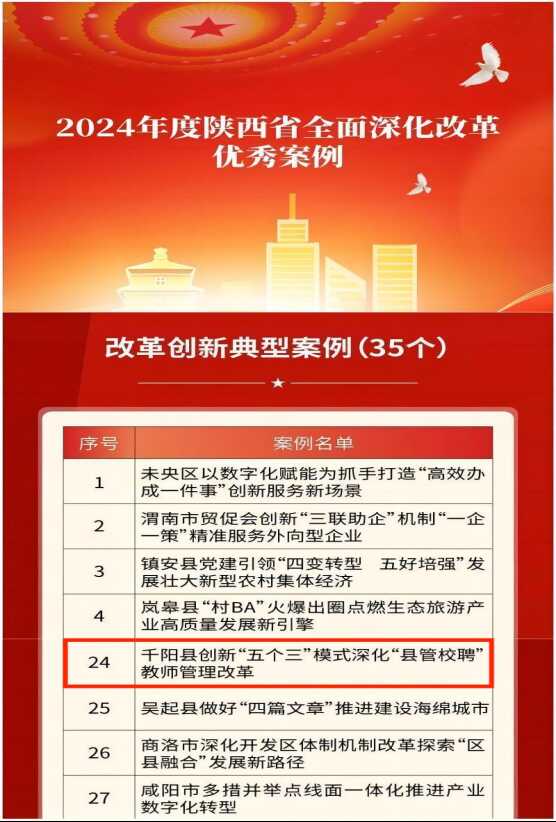 2月10日,陕西省委全面深化改革委员会办公室公布“2024年度陕西省全面深化改革优秀案例”,《千阳县创新“五个三”模式,深入推进“县管校聘”教师管理改革》经验获评“改革创新典型案例”。