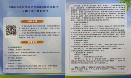 二是一卡提醒后续事项。为帮助企业群众了解办理证照后的事项,创新推出“照后事项提醒卡”,将企业年审、变更、备案等“全生命周期”事项写进卡片中,温馨提示并引导群众企业通过微信公众号、陕西政务服务网等方式办理有关事项,让“指尖办”“马上办”成为现实。