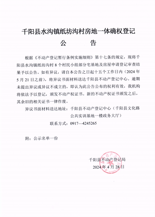 千阳县水沟镇纸坊沟村房地一体确权登记公告