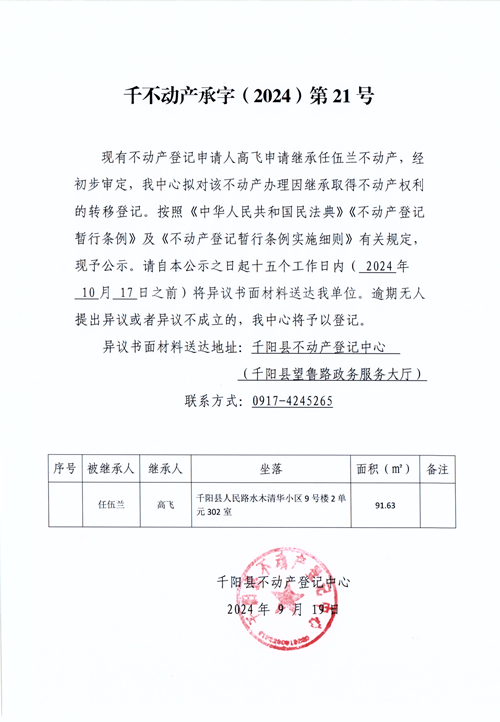千阳县不动产继承登记公告(千不动产承字(2024)第21号)