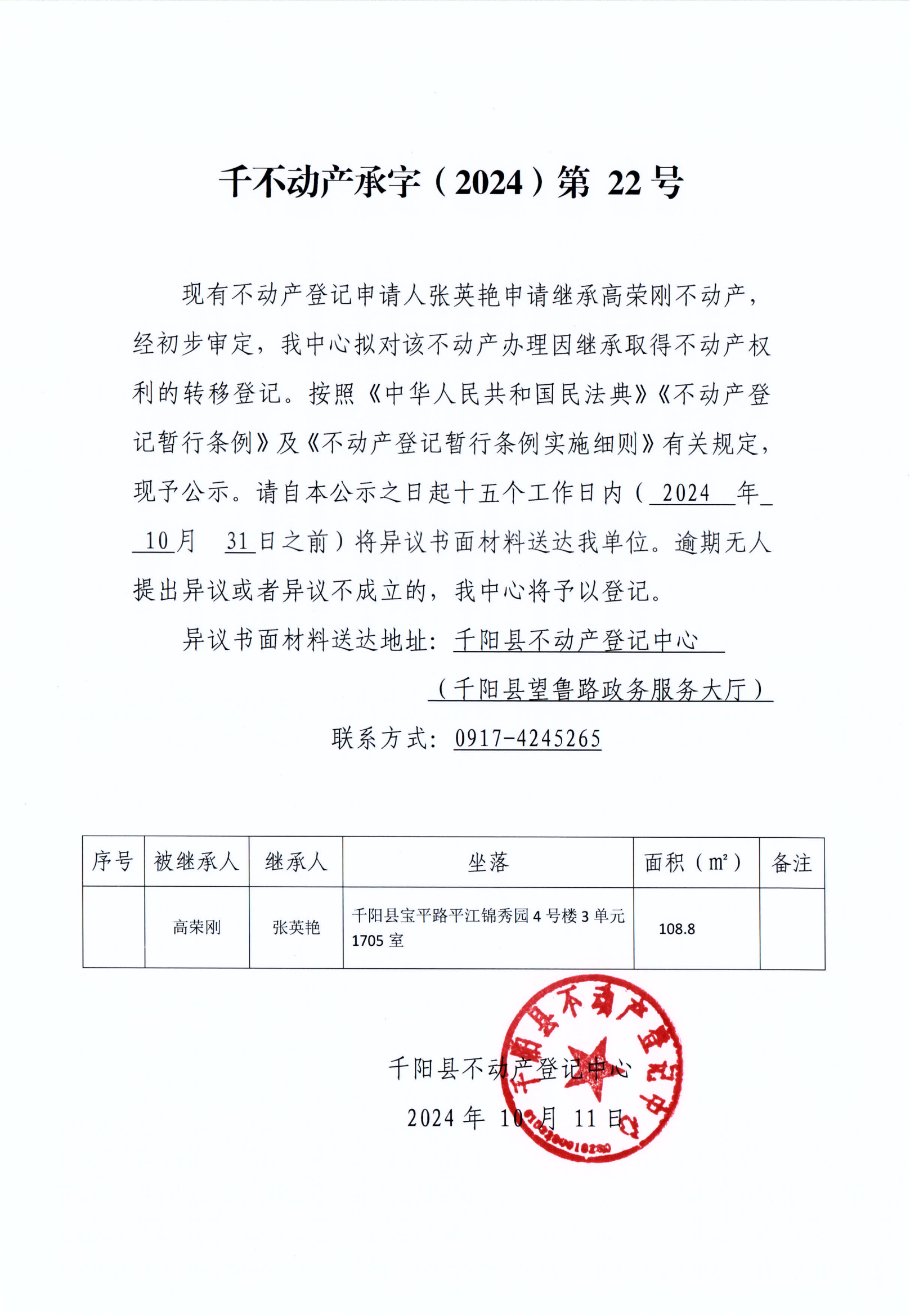 千阳县不动产继承登记公告(千不动产承字(2024)第22号)