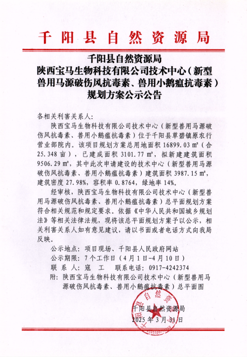 陕西宝马生物科技有限公司技术中心(新型兽用马源破伤风抗毒素、兽用小鹅瘟抗毒素)规划方案公示公告