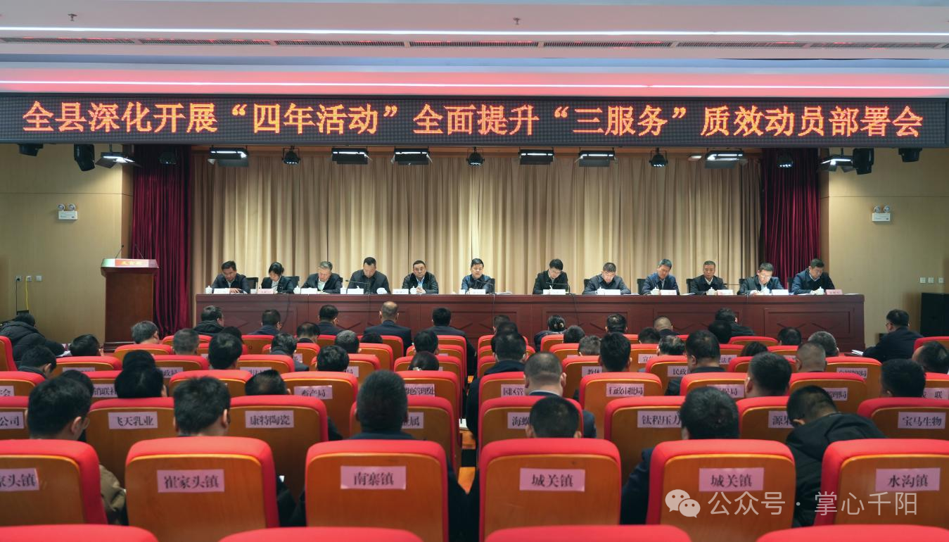 3月2日,千阳县召开深化开展“四年活动”全面提升“三服务”质效动员部署会。县委书记刘方斌参加会议并讲话。他强调,要深入学习贯彻党的二十届四中全会精神和习近平总书记历次来陕和来宝考察重要讲话重要指示,认真落实党中央决策部署和省市委工作要求,深化开展“四年活动”,全面提升“三服务”质效,以正确政绩观引领推动“十五五”开好局、起好步。县长张湛林主持会议,县政协主席边剑锋、县委副书记王欣参加会议。