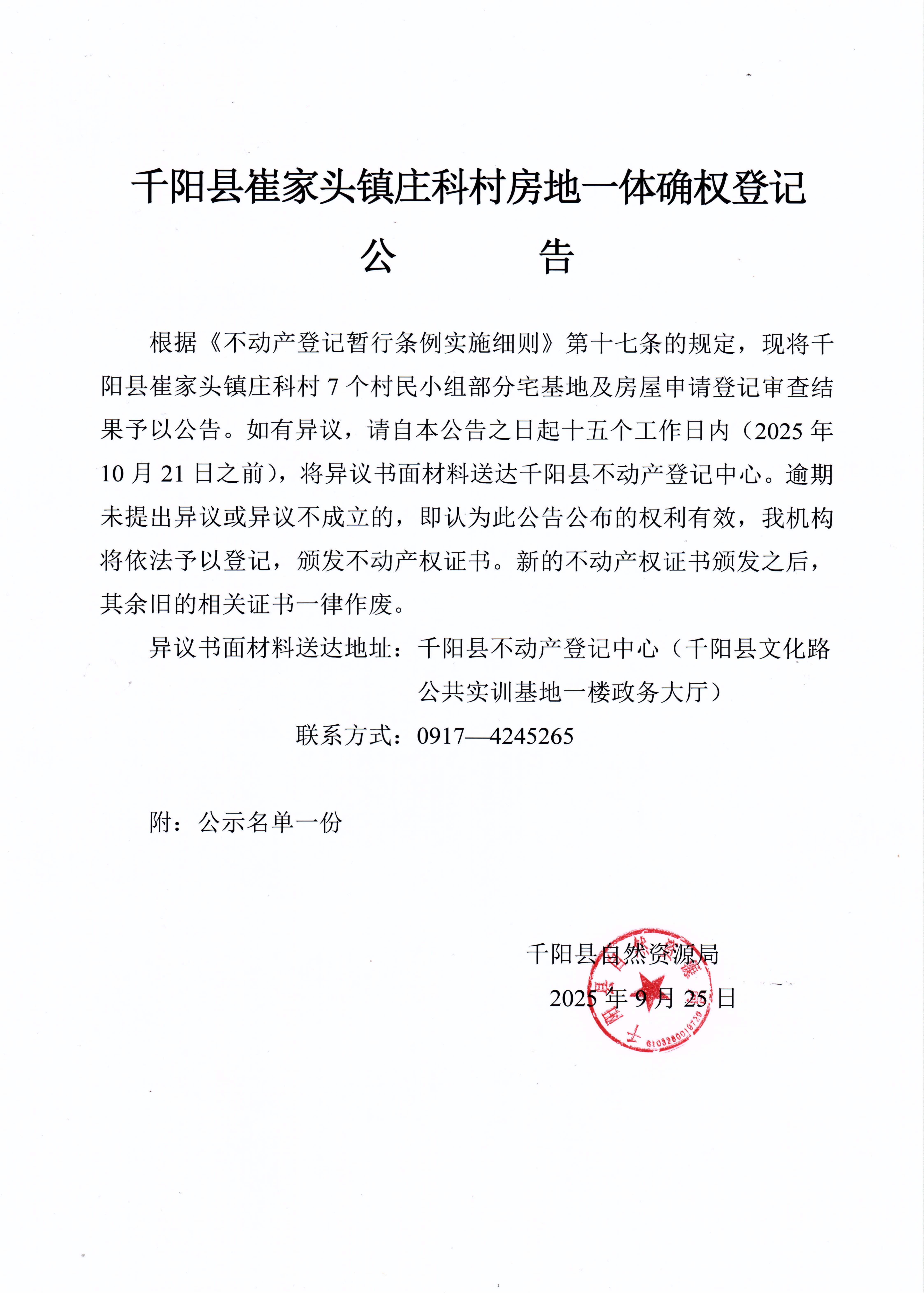 千阳县崔家头镇庄科村房地一体确权登记公告