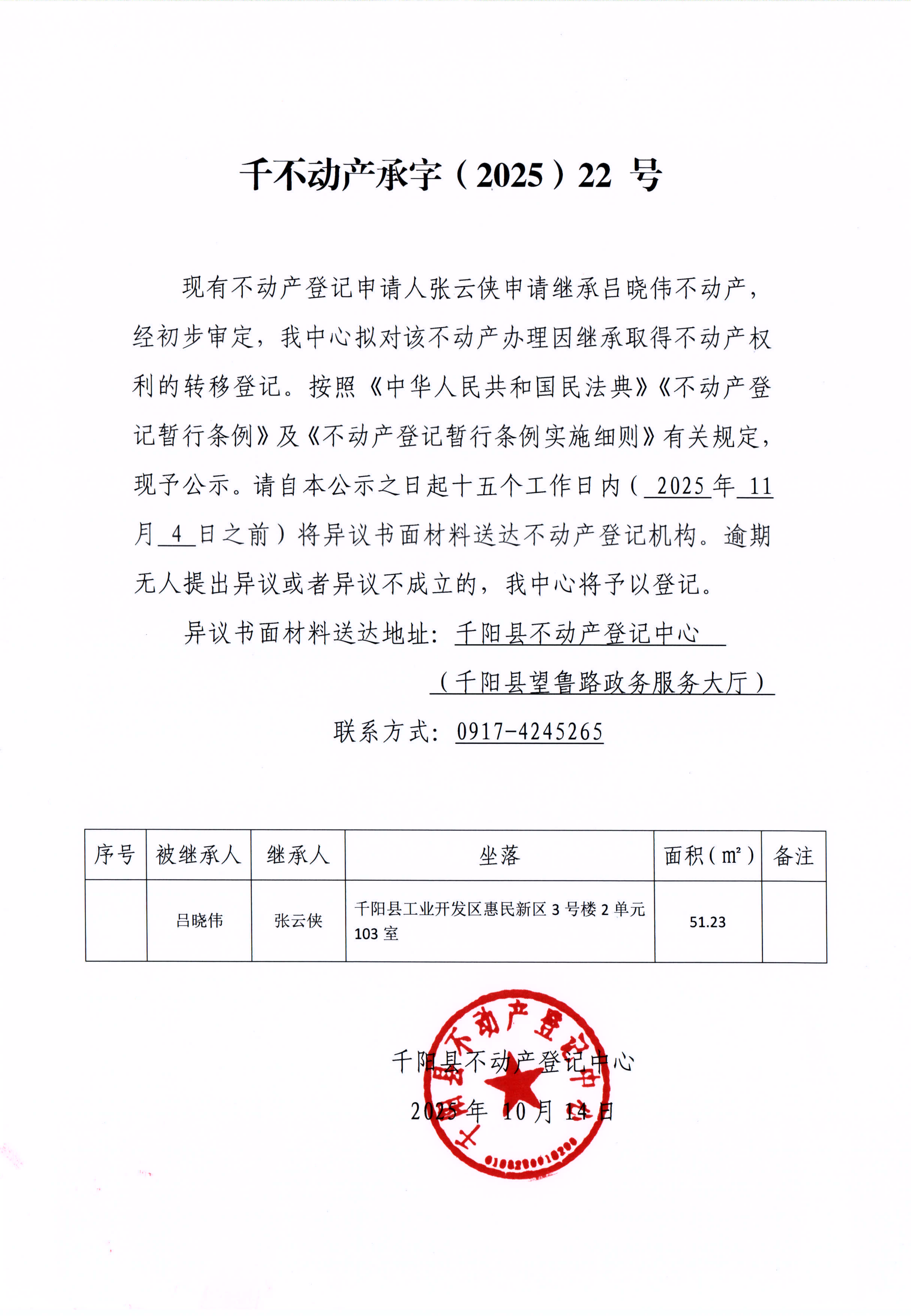 千不动产承字(2025)第22号