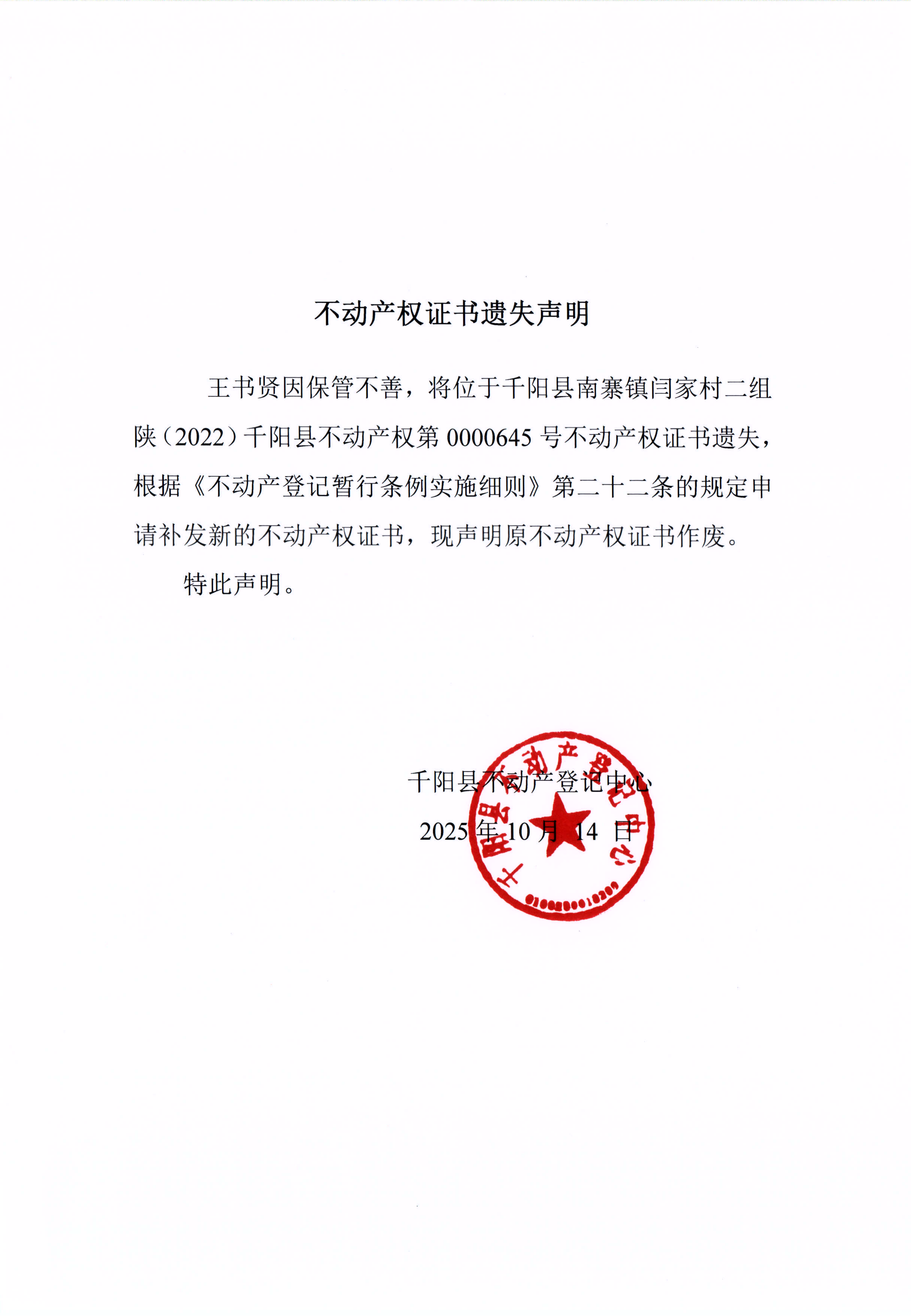 不动产证明遗失声明