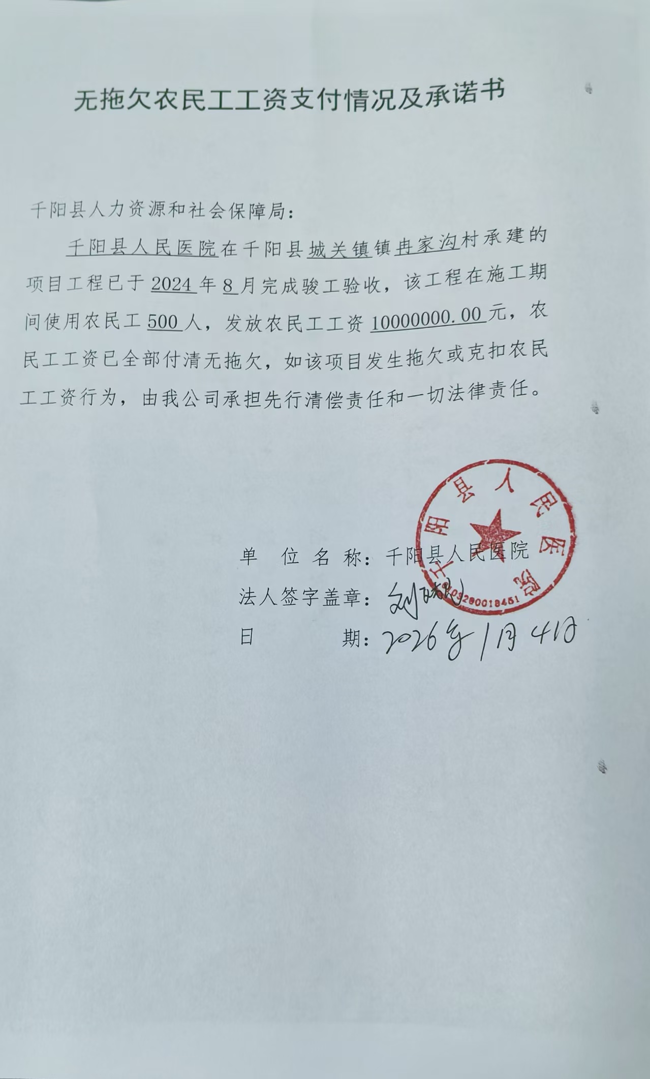 你们辛苦了!感谢你们为千阳建设付出的艰辛劳动!根据《宝鸡市农民工工资支付保证金管理办法》规定,千阳县人民医院于2019年11月19日预存了农民工工资保证金,工程现已竣工。现对该工地民工工资支付情况进行公示。