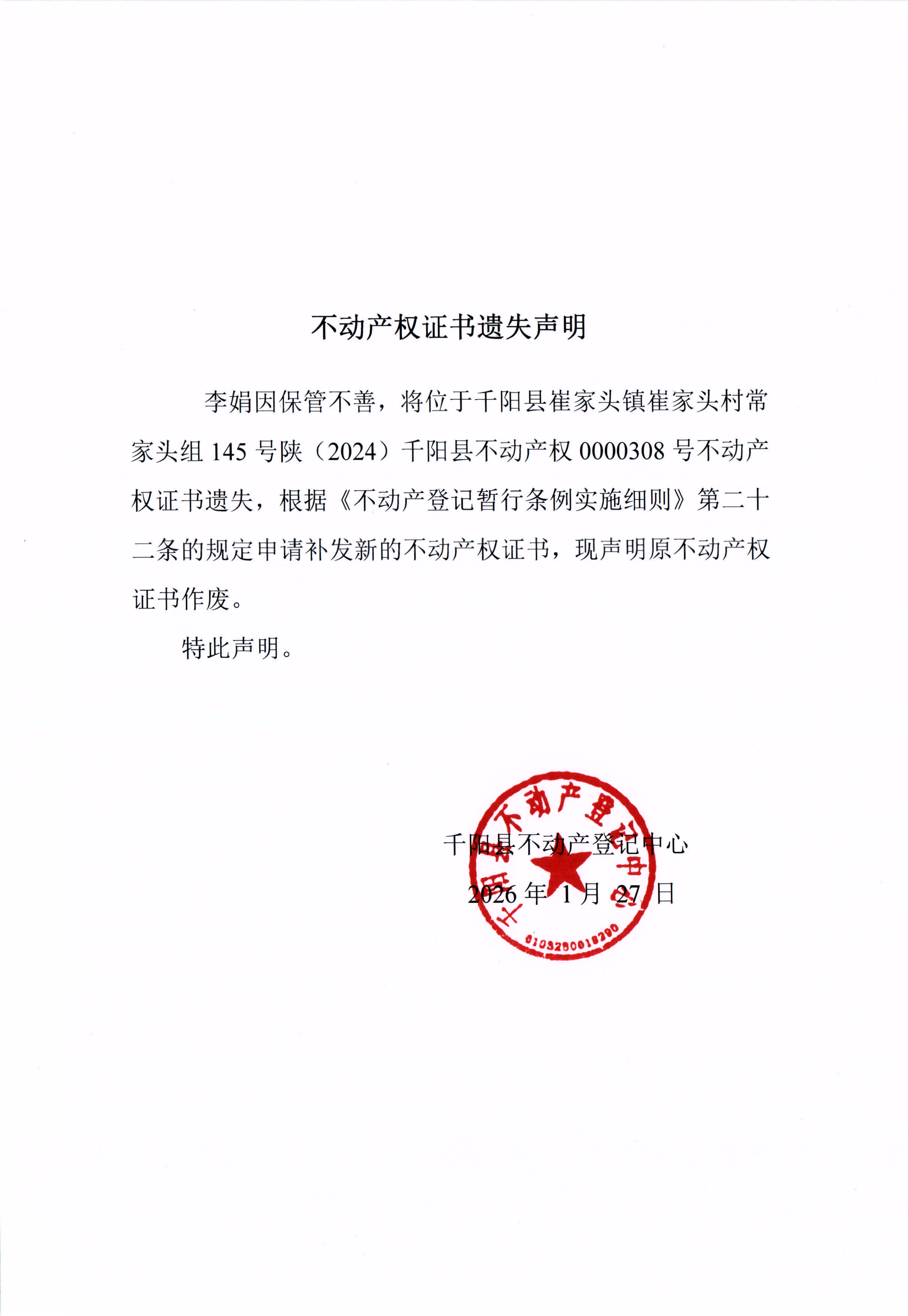 不动产证明遗失声明