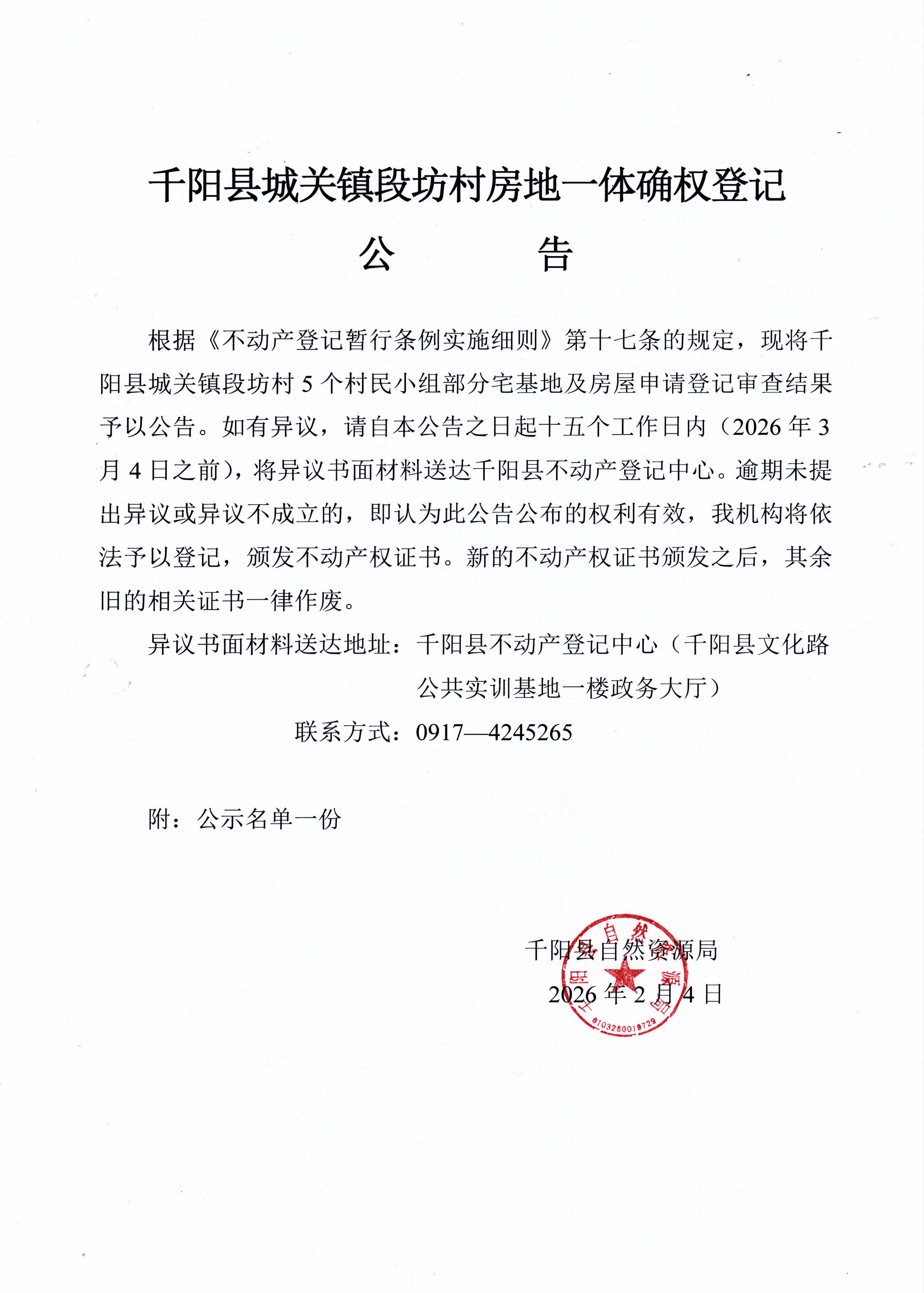 千阳县城关镇段坊村房地一体确权登记公告