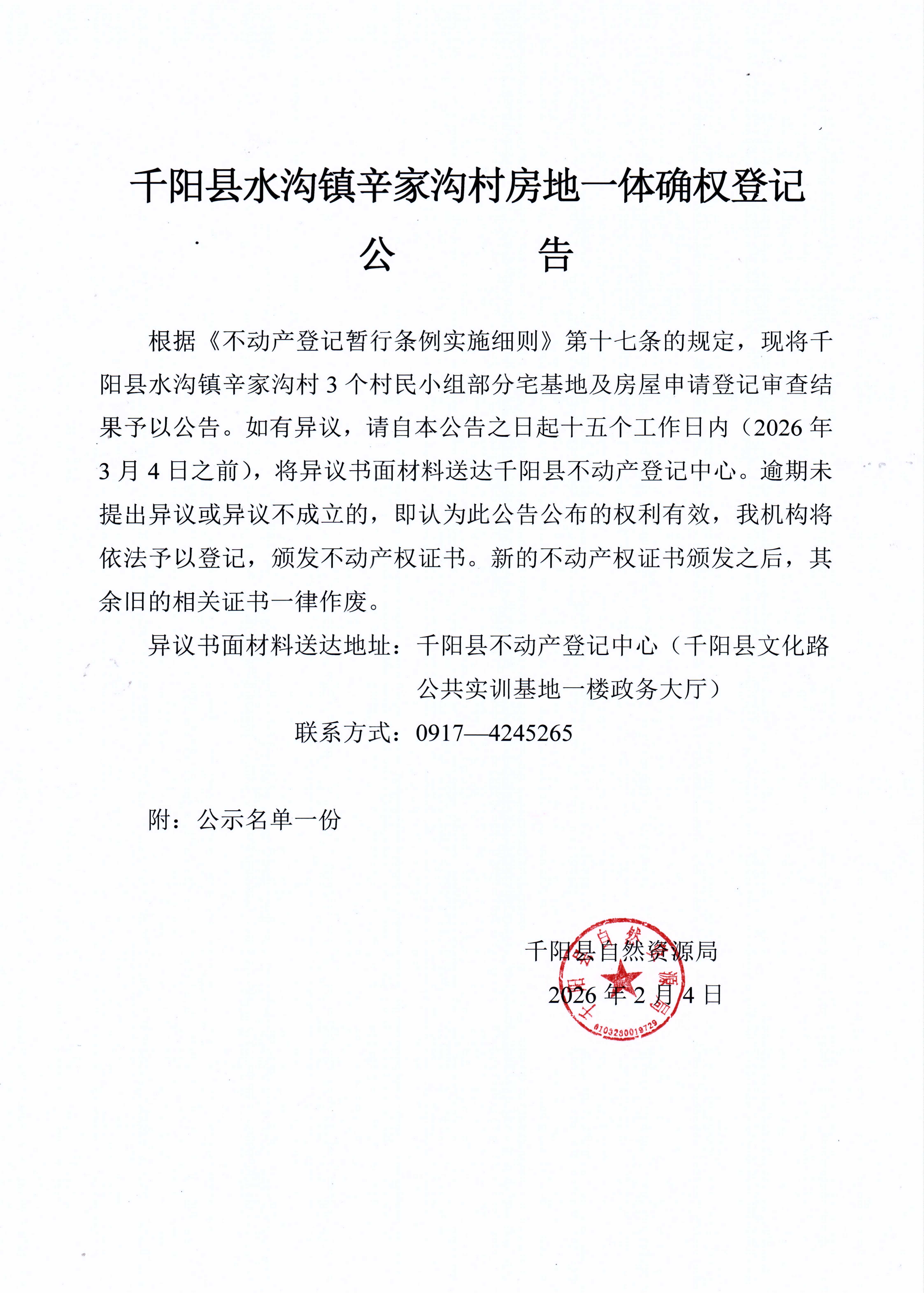 千阳县水沟镇辛家沟村房地一体确权登记公告