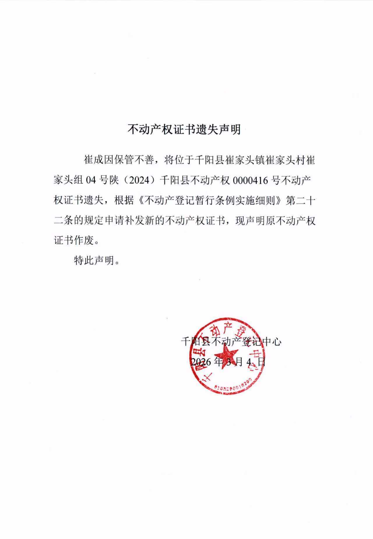 不动产证明遗失声明