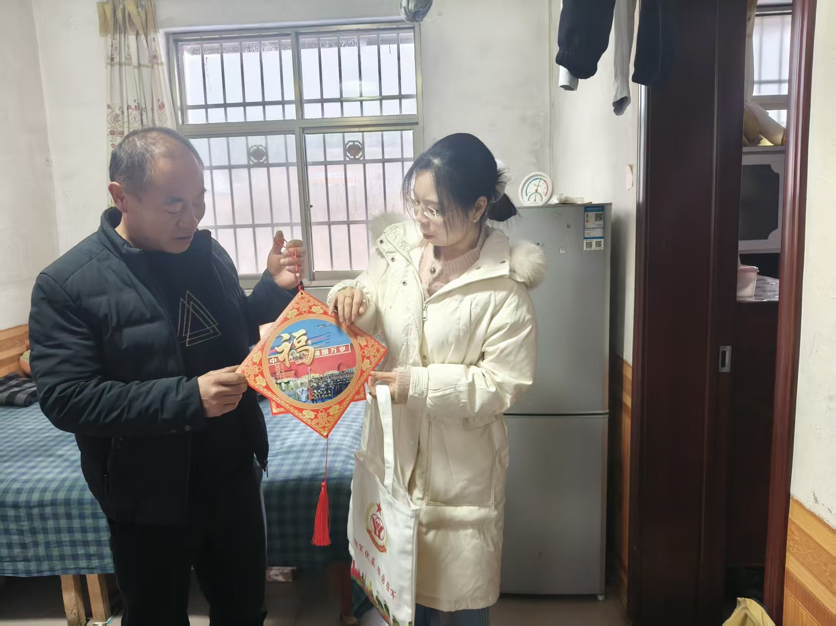 活动前期,县退役军人事务局精心筹备,各镇村(社区)退役军人服务站同步行动,提前摸排辖区退役军人信息,重点关注高龄、独居、伤残及生活困难退役军人群体,精心准备了寓意吉祥的中国结、烫金福字、新春春联等慰问品,让每份祝福都饱含心意。活动中,工作人员与志愿者组成多支送福小分队,采取“上门挂福+现场送福”相结合的方式,深入退役军人家中、社区服务点,为老兵们亲手挂上红彤彤的中国结,贴上喜庆的福字与春联。红彤彤的中国结映着老兵们的笑容,喜庆的福字装点着庭院,不仅让老兵们的家中满是新春氛围,更让这份拥军崇军的温情直抵心间。